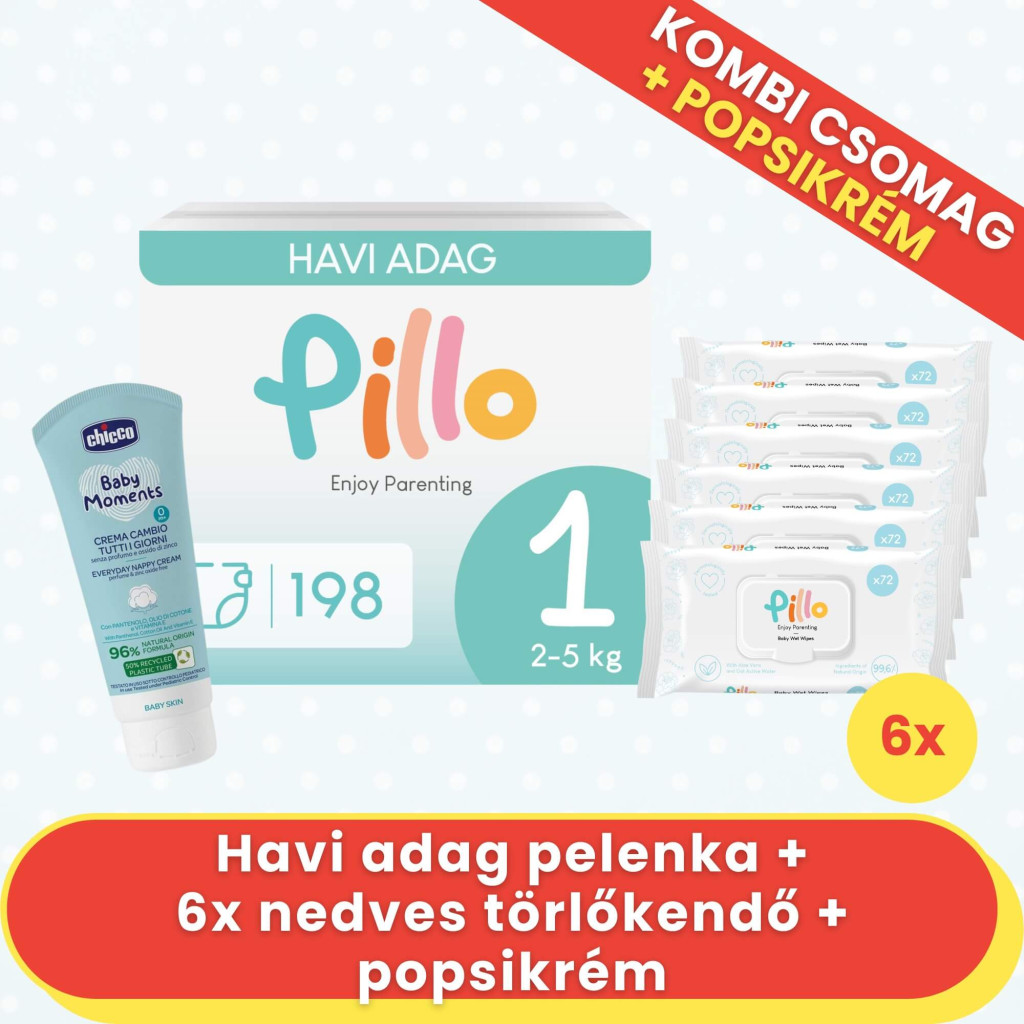 PILLO mindenmentes PURE pelenka KOMBI+ CSOMAG (törlőkendővel és popsikrémmel) - 1-es méret (2-5 kg)