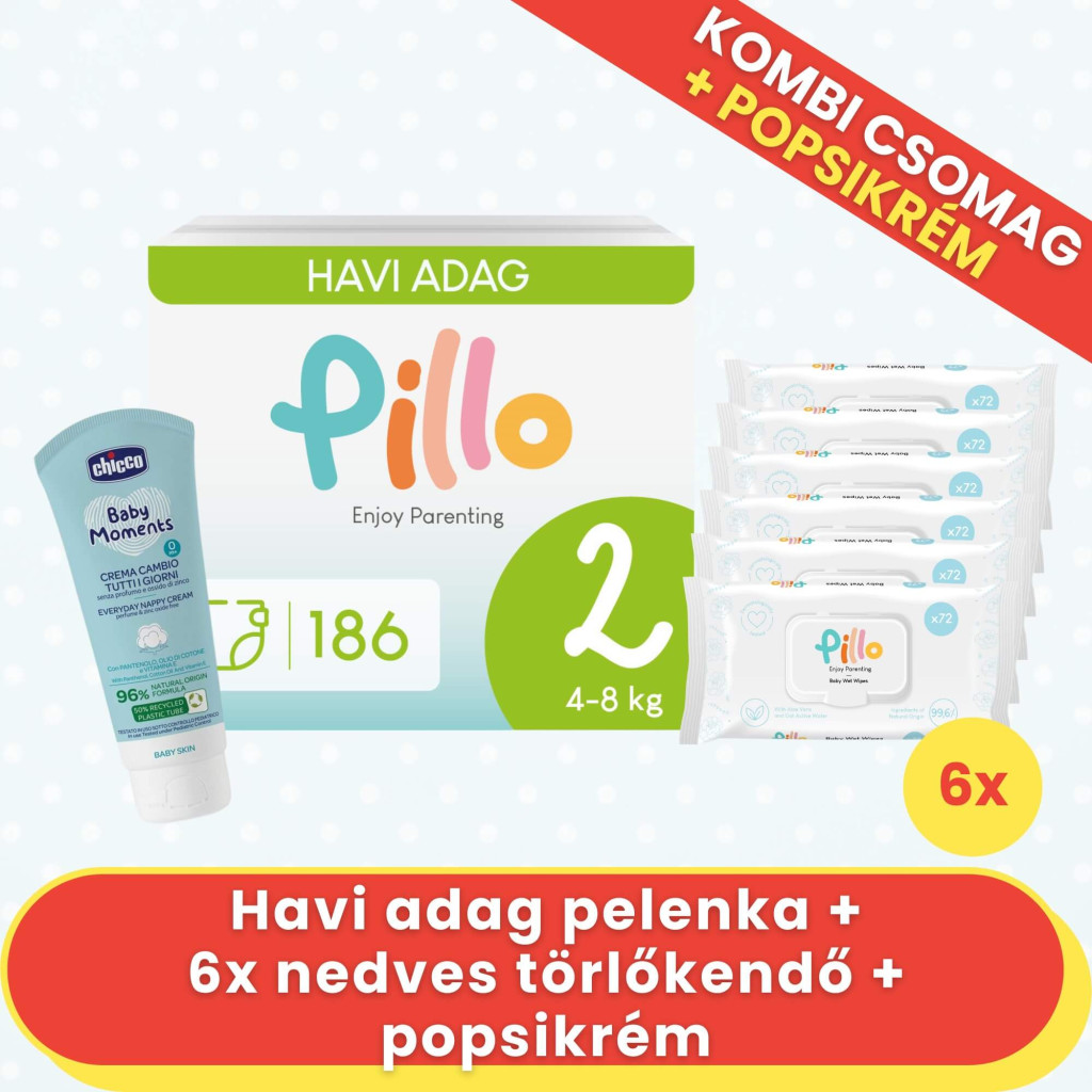 PILLO mindenmentes PURE pelenka KOMBI+ CSOMAG (törlőkendővel és popsikrémmel) - 2-es méret (4-8 kg)