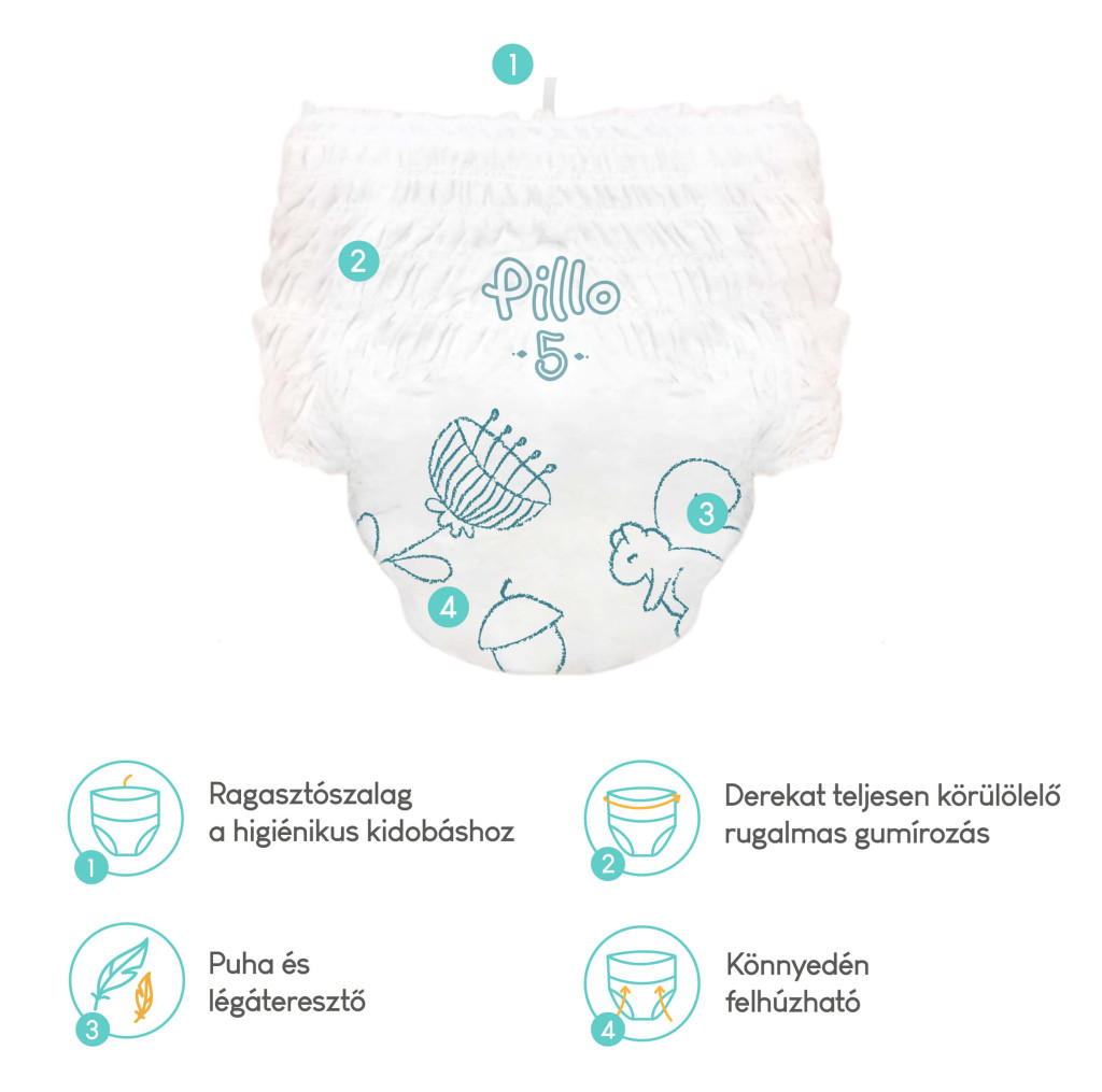 • A Pillo bugyipelenka rugalmas derék- és combkialakítása miatt rendkívül kényelmes, továbbá a totyogó fokozott aktivitása mellett is a helyén marad, nem csúszik le és nem csúszik el, tökéletesen illeszkedik az izgő-mozgó gyermekre.