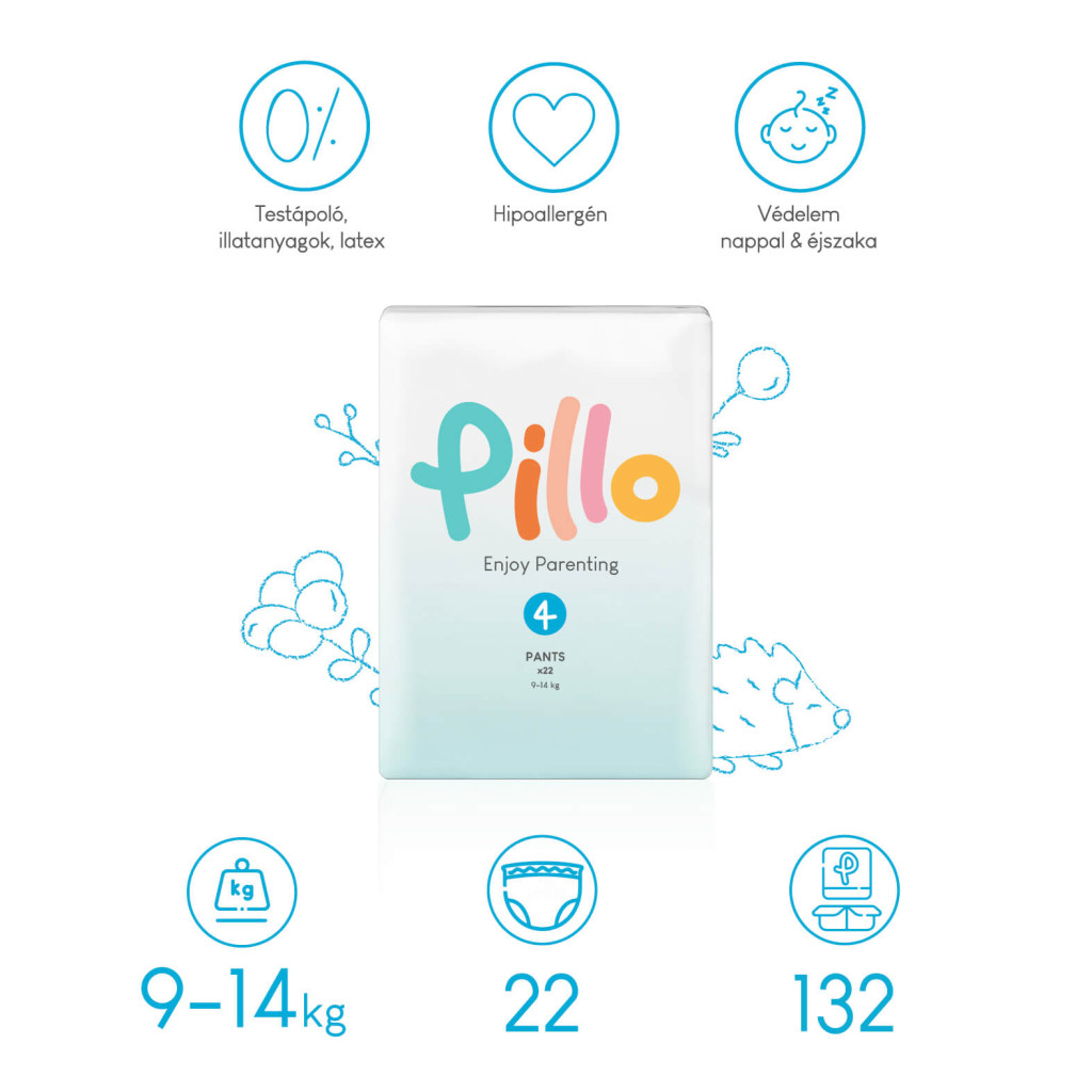 A Pillo „mindenmentes”: illat-, testápoló- és ftalátmentes, EU által listázott gyermekre ártalmas vegyszerektől mentes, dermatológiailag tesztelt.