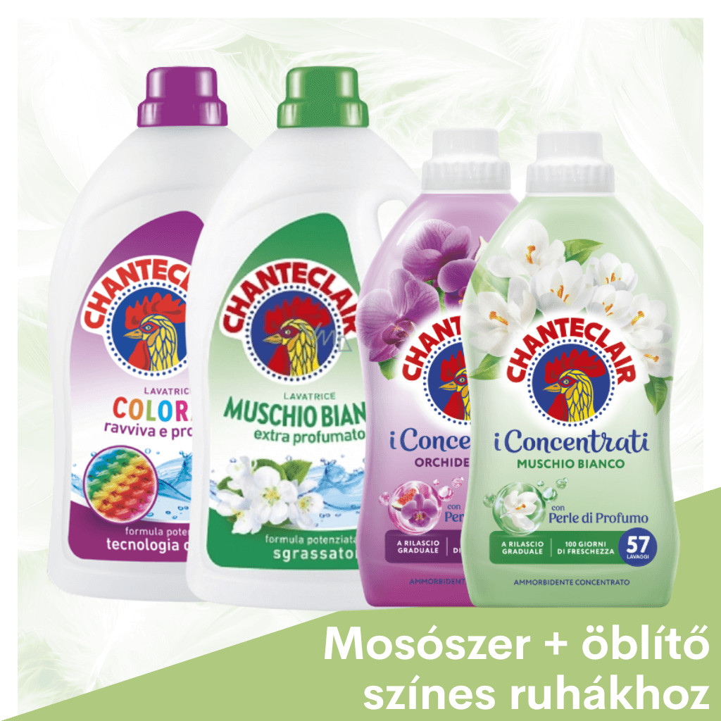 Adj ragyogó tisztaságot és puhaságot a színes ruháidnak egy okosan összeállított csomaggal! A Chanteclair csomag a mindennapi mosást teszi egyszerűbbé: egymáshoz illő mosószer és öblítő kombinációk, ikonikus olasz illatokkal és megbízható tisztítóerővel. Tudatos idő- és pénzmegtakarítás egyetlen kattintással – különösen akkor, ha kisgyerekek mellett minden perc számít.