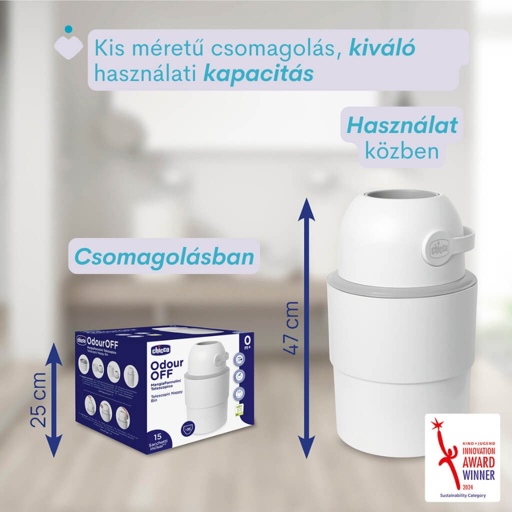 A Chicco pelenkatároló teleszkópos kialakítása a gyakorlatban azt jelenti, hogy a használt pelenka a fedél bezárásával egy zártabb térbe kerül, megakadályozva a levegőcserét és a kellemetlen szagok terjedését. A nyitás-zárás folyamata egyszerű és gyors, mindennapi használatban is kényelmes – babával a kézben sem jelent plusz kihívást. Kompakt mérete miatt kis helyen is elfér, és könnyen odébb tehető, ha éppen a lakás más pontján alakítanál ki pelenkázóállomást.