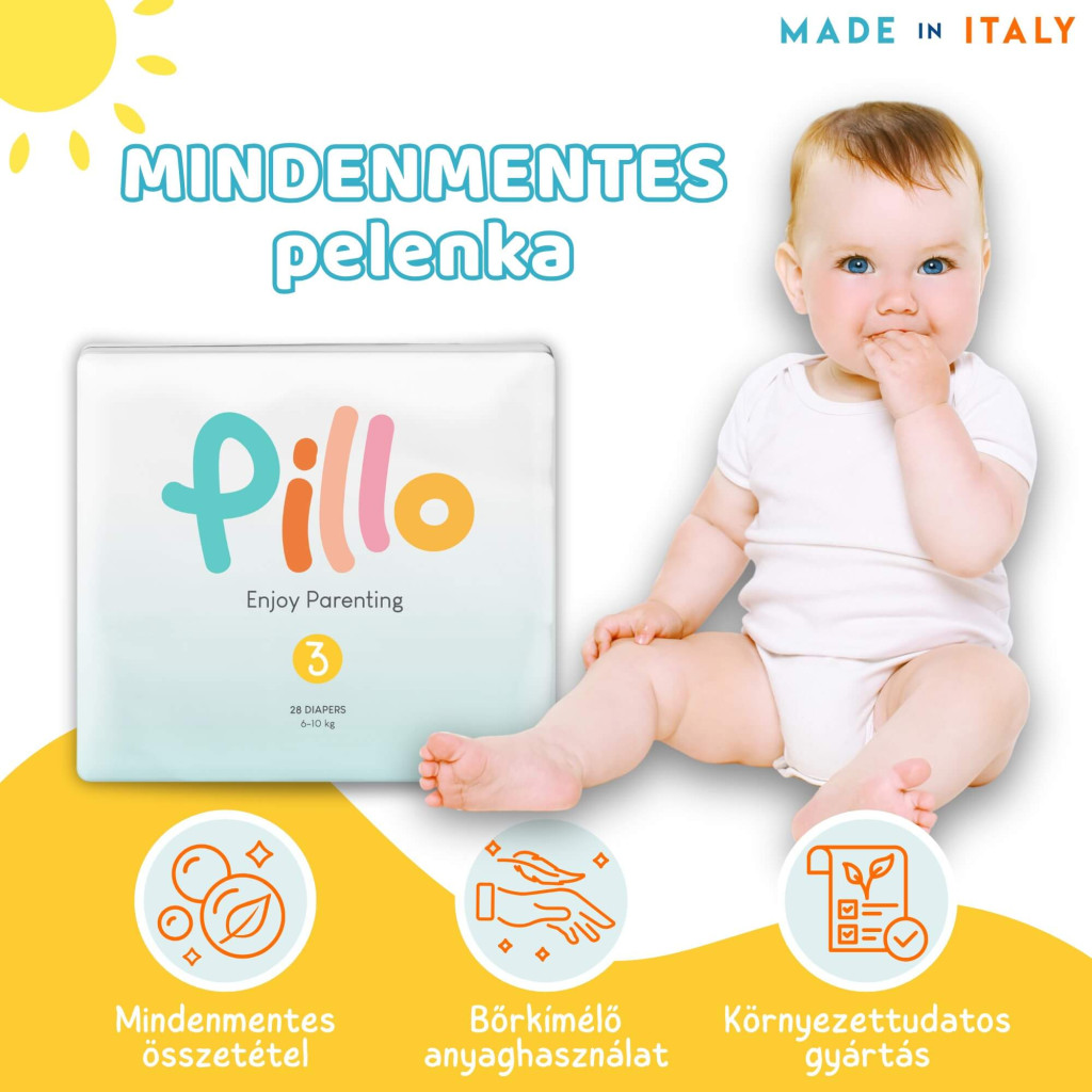 • A Pillo pelenkák 100%-ban Olaszországban gyártott pelenkák, ami egyet jelent a minőséggel, stílussal és presztizzsel.