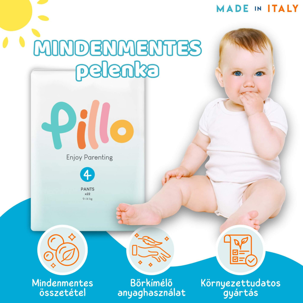 • A Pillo pelenkák 100%-ban Olaszországban gyártott pelenkák, ami egyet jelent a minőséggel, stílussal és presztizzsel.