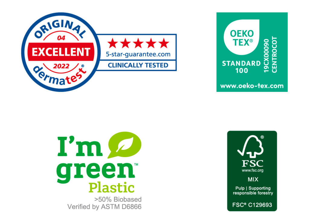 Dermatest 5 csillag, OEKO-TEX Standard 100, FSC mix, I’m Green Plastic.